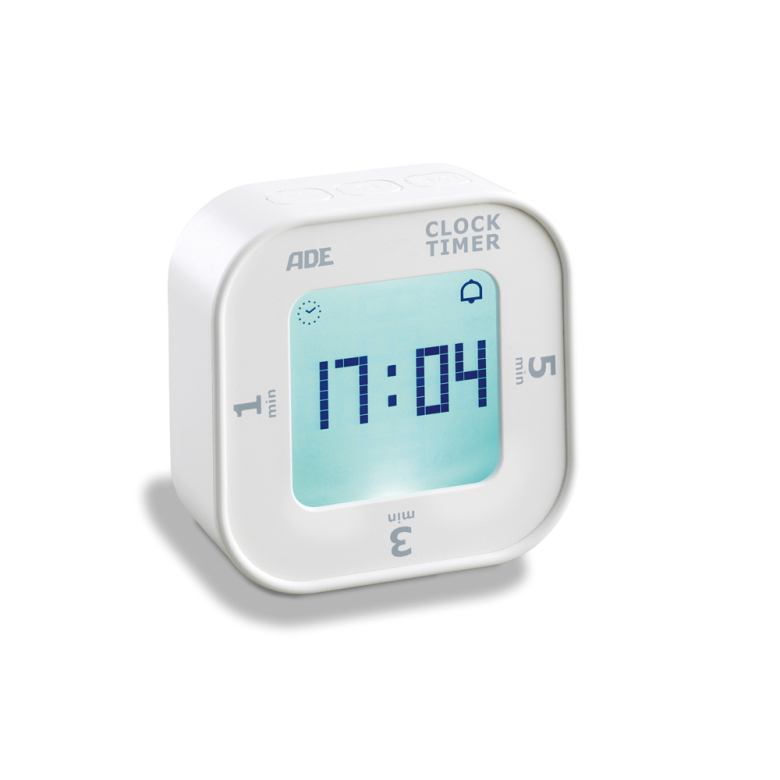 Tilta eller trycka. Det är dags för den digitala kökstimern med tilt-start från ADE, som också visar aktuell tid och fungerar väl utanför köket! Den har tre förinställda nedräkningar: 1, 3 och 5 minuter. De kan aktiveras mycket enkelt genom att luta timern till respektive sida. Även enskilda tider kan ställas in på LCD-skärmen genom att bara trycka på en knapp. När tiden är slut signalerar displayen: Klar! Men ett akustiskt larm kan också ställas in. Bär du din timer med dig? Då är vibrationslarmet meningsfullt, vilket också är ett tillgängligt val.