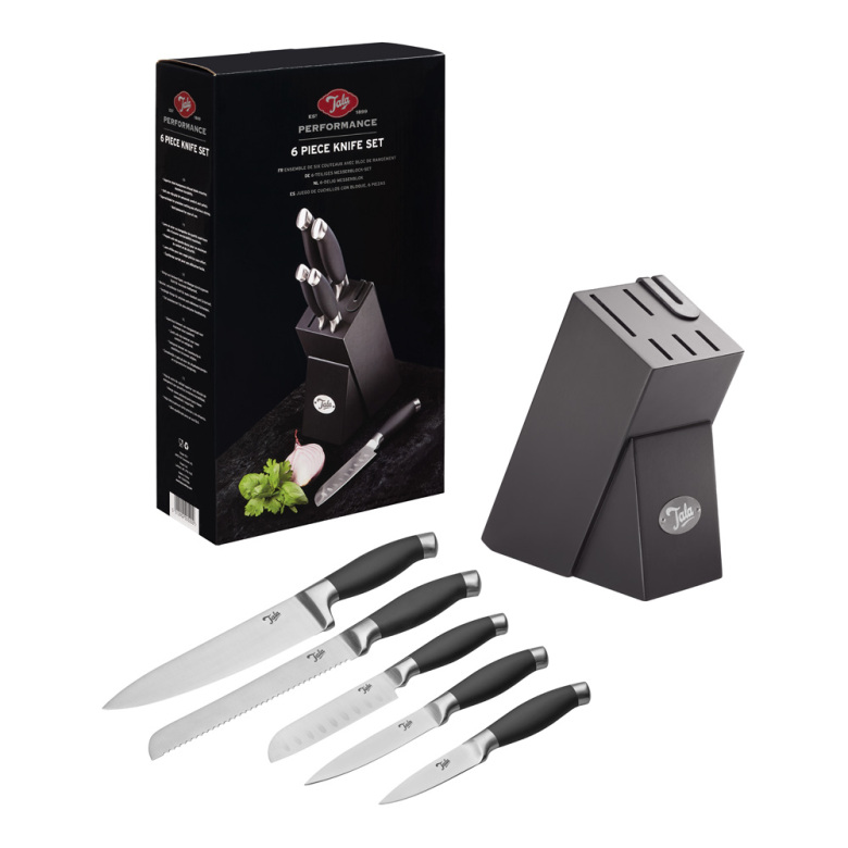 Tala 6-delade knivblockset är ett viktigt tillskott till alla kök. Setet har en mängd olika knivar inklusive en 20 cm brödkniv med en tandad kant för att skiva bröd 20 cm .Kockkniv för att tärna och hacka 12,5 cm .Santoku Kniv för att skära i tärningar och hacka 11,5 cm.Tandad Utility Kniv med sågtandad kant till frukt eller annan skivning avgrönsaker och en 9 cm skalkniv för skalning.