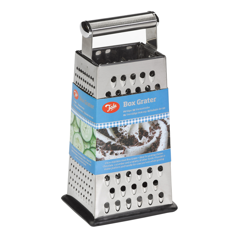 Ett 23 cm högt, stående rivjärn, perfekt för att riva ost, choklad, gurka och andra livsmedel. Har en stabil plattform av gummi så att den står still när man använder den. Totalt 4 st olika rivstorlekar. Diskmaskinssäker