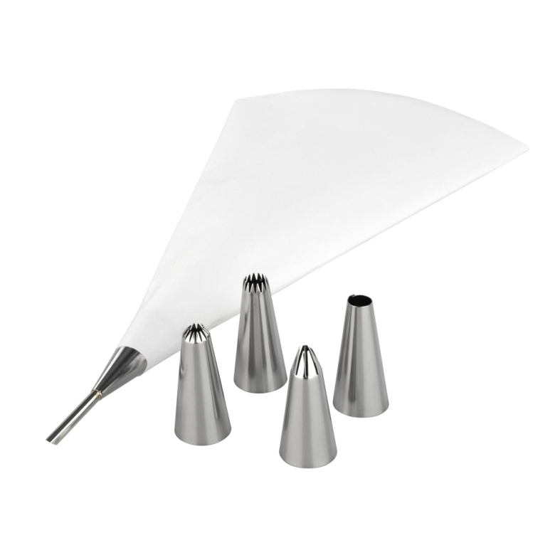 Denna uppsättning innehåller spritspåse 26 cm av god kvalitet, en skruvadapter för att underlätta byte av tyllar och 5 tyllar av rostfritt stål som täcker ett urval av mönster.